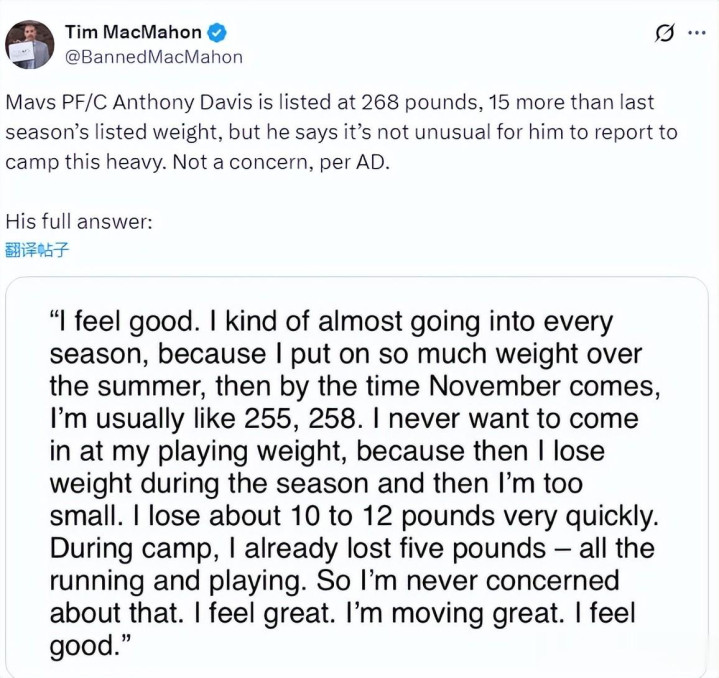 北京时间10月2日,据美媒报道,独行侠球星安东尼-戴维斯自上赛季以来体重增加了15磅(约6.8公斤),浓眉明显胖了一圈,对此浓眉回应称一点也不担心,增重是为了防止赛季中期体重下降导致身体单薄,他还透露已通过训练营减重5磅。