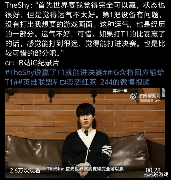 在纪录片中,当话题来到S15全球总决赛IG对阵T1的那场生死战时,几位队员的发言风格迥异。打野Wei和AD选手Gala表达了可惜与难过,辅助Meiko希望大家保持心态继续进步,而中单Rookie则显得非常不好意思。但轮到上单TheShy时,画风突变。他直言不讳地表示,世界赛我们完全能赢,大家状态都很好,但就是运气不太好。