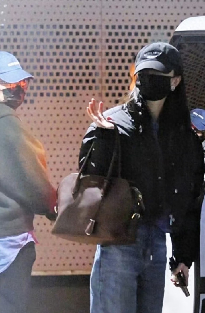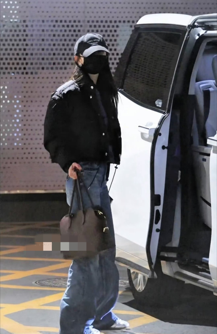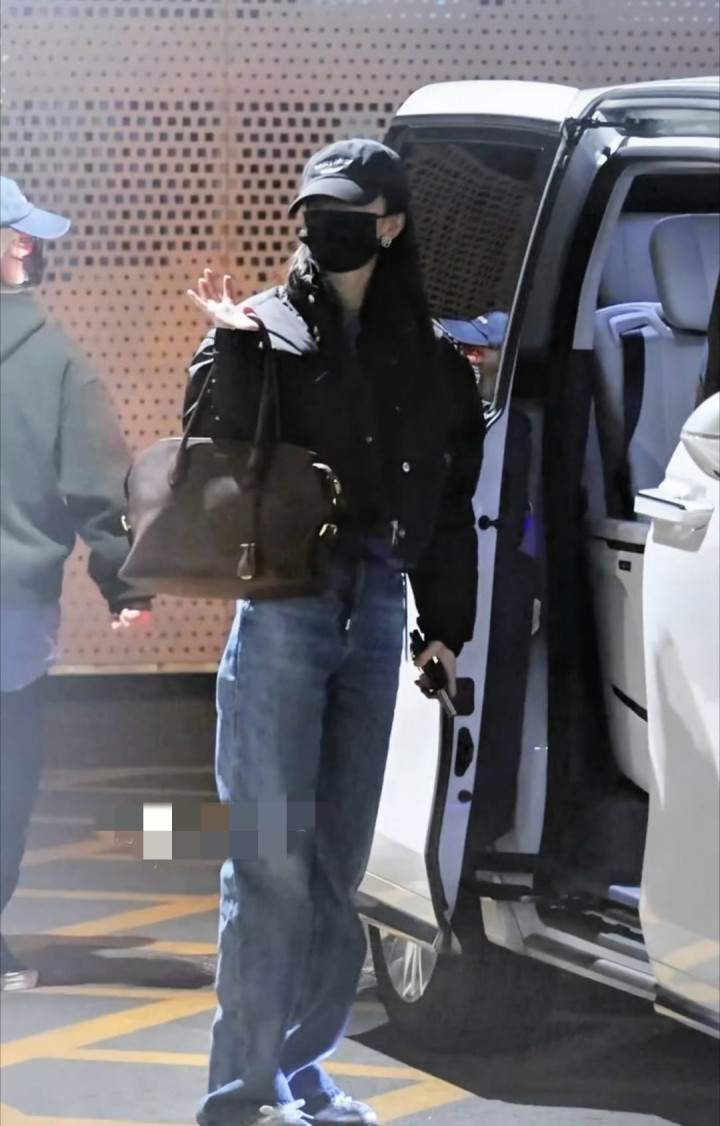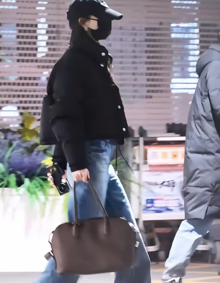 杨幂冬季出行穿搭, 黑色短款羽绒绒服加牛仔阔腿裤, 既保暖又时尚
