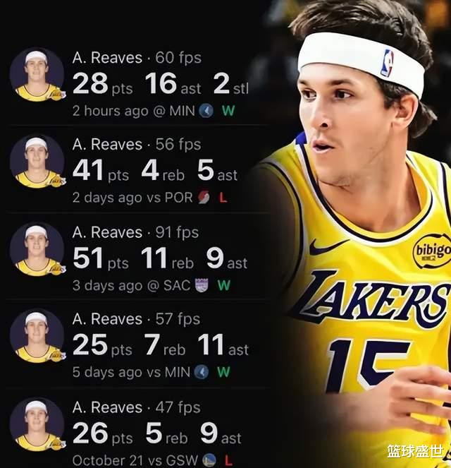根据数据统计,里夫斯在最近三场比赛中,交出一份40分10助攻的场均数据单,一举成为湖人自1970年韦斯特之后,第二位连续三场常规赛中打出场均至少40+10的球员,而在此之前,里夫斯已经在赛季第二战打出单场11次助攻。